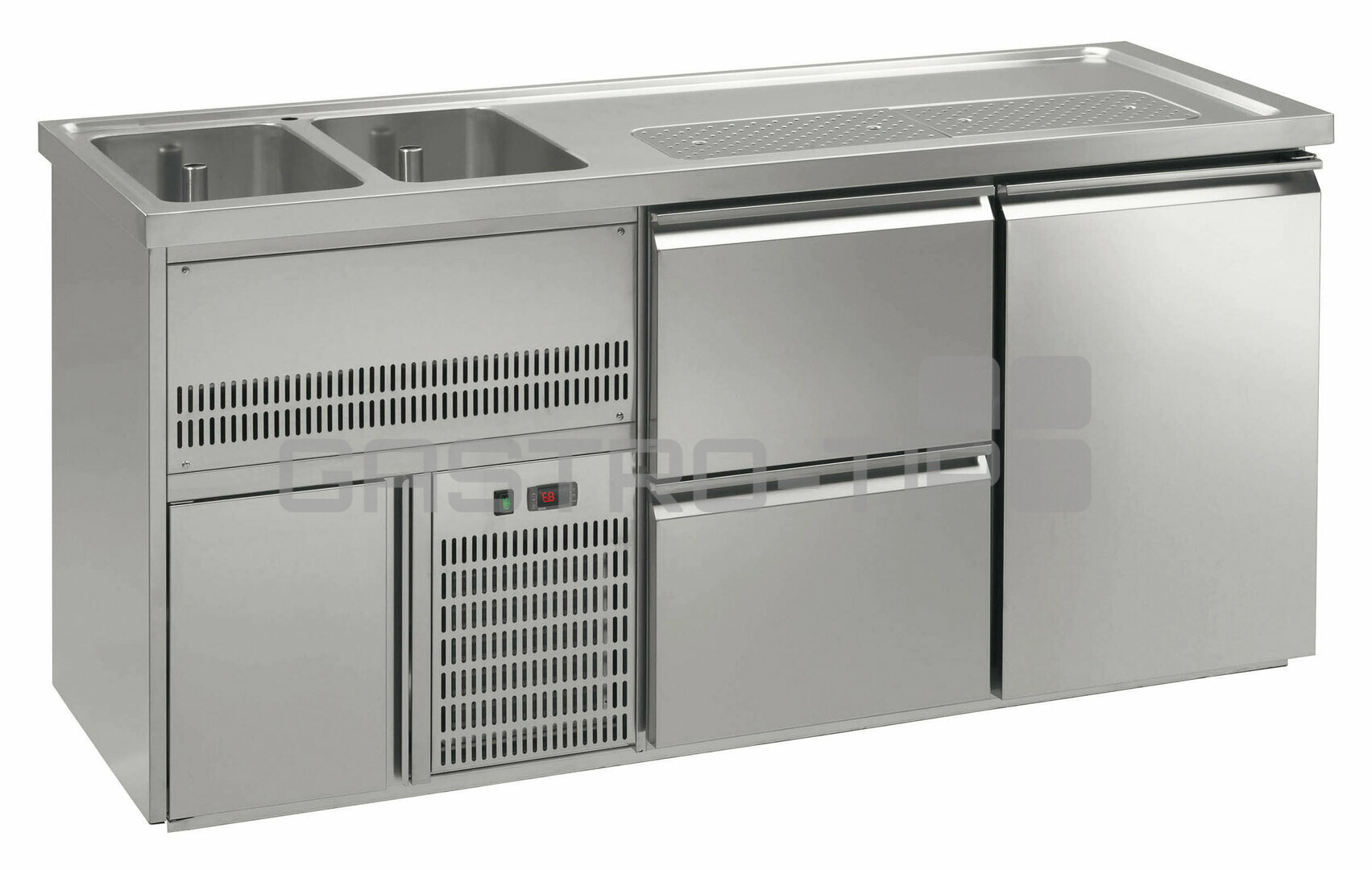 Chladící barové stoly RBPD / RBPS-220E, 212E, 230E a 222 E vyrobeny v celonerezovém provedení (AISI 304) s prolisovanou pracovní deskou, odkapní plochou (950 x 250 mm) a dvoudřezem 2x (300 x 500 x...