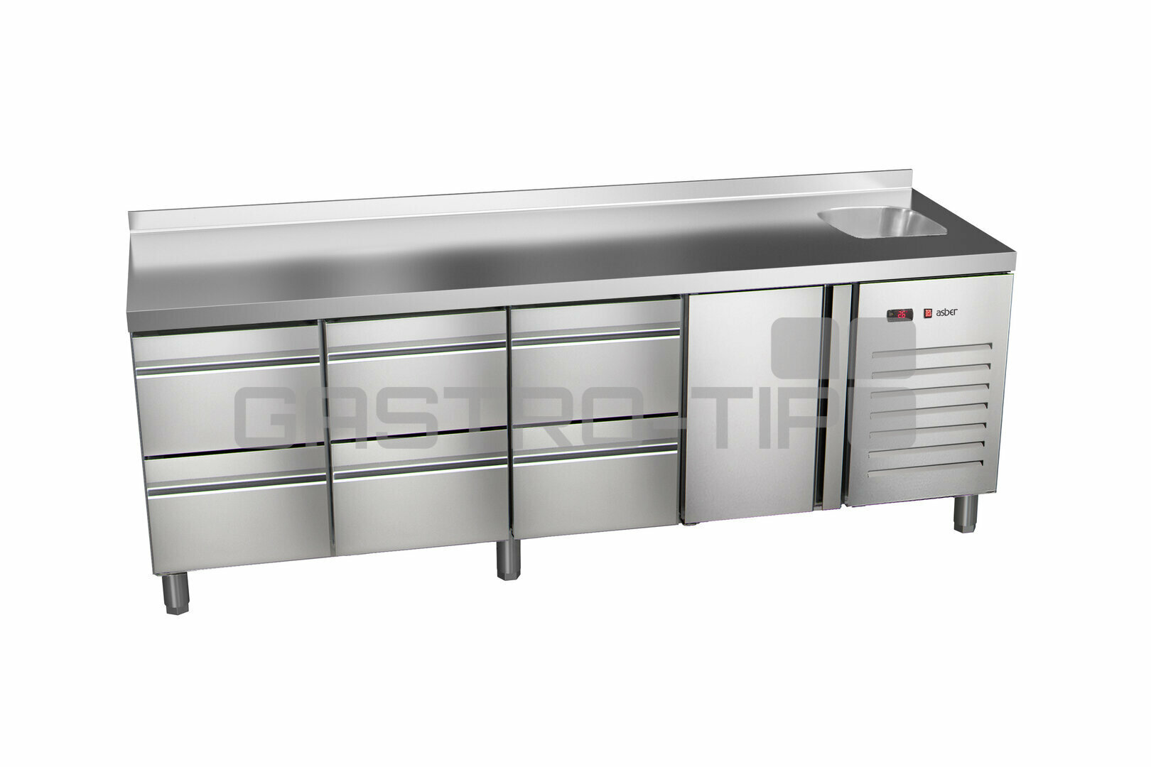 - Odolná pracovní deska z nerezové oceli 50 mm se 40 mm vysokým zadním lemem, zabránění rozlití za stůl.