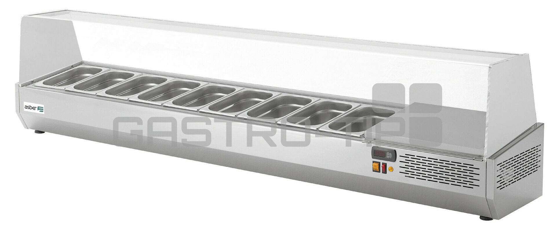 Chladící pizza nástavba ASBER GV (dříve EV) v celonerezovém provedení s proskleným vrchním hygienickým zákrytem (otevřený ze strany obsluhy) určena nejenom pro pizza chladící stoly ASBER. Speciálně vyrobena z vysoce kvalitní nerezové oceli pro náročné profesionální provozy, vyznačující se velmi robustním designem a dokonalým zpracováním, odtok vody speciálně navržený pro snadné čistění. Vitríny se statickým chlazením a vestavěnou jednotkou jsou určeny pro uchovávání chlazených ingrediencí pro přípravu pizzy, salátů, sendvičů a dalších pokrmů v nerezových GN nádobách (velikost dle modelu GN1/4, nebo GN1/3) s hloubkou maximálně 150mm. Intuitivní digitální ovládání (snadné nastavení teploty a parametrů), teplotní rozsah od +2°C do +8°C, klimatická třída IV, světelné tlačítko start-stop, ekologický chladicí plyn: R600 Hydrofluorouhlík (HC), napájecí napětí: 230V1N/50 Hz.