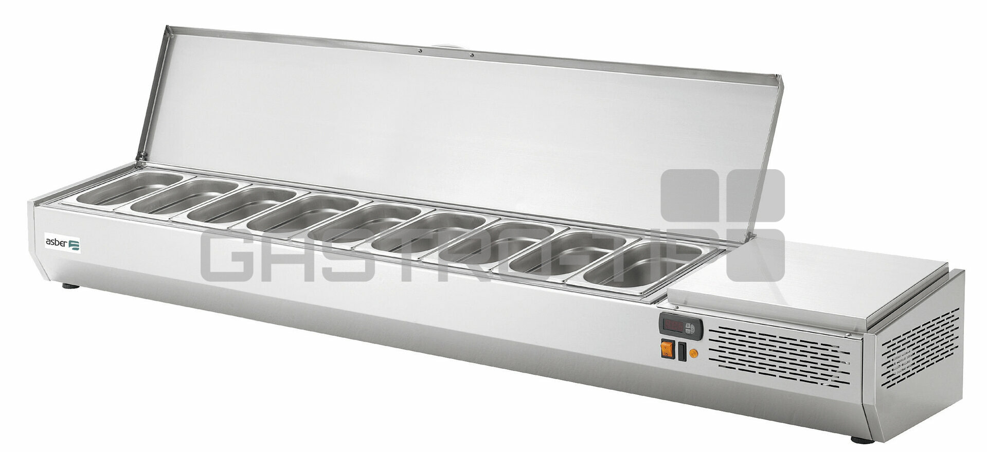 Chladící pizza nástavba ASBER GVL (dříve EVL) v celonerezovém provedení s vrchním nerezovým krycím víkem (sklopným s fixací v otevřeném stavu) určena nejenom pro pizza chladící stoly ASBER. Speciálně vyrobena z vysoce kvalitní nerezové oceli pro náročné profesionální provozy, vyznačující se velmi robustním designem a dokonalým zpracováním, odtok vody speciálně navržený pro snadné čistění. Vitríny se statickým chlazením a vestavěnou jednotkou jsou určeny pro uchovávání chlazených ingrediencí pro přípravu pizzy, salátů, sendvičů a dalších pokrmů v nerezových GN nádobách (velikost dle modelu GN1/4, nebo GN1/3) s hloubkou maximálně 150mm. Intuitivní digitální ovládání (snadné nastavení teploty a parametrů), teplotní rozsah od +2°C do +8°C, klimatická třída IV, světelné tlačítko start-stop, ekologický chladicí plyn: R600 Hydrofluorouhlík (HC), napájecí napětí: 230V1N/50 Hz.