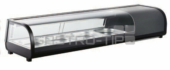 Pultová chladicí vitrína délky 1177mm je určena k prezentaci a prodeji různých potravin (včetně SUSHI). Elegantní bílo šedé provedení, oblé čelní sklo, ze strany obsluhy 2 posuvná dvířka,vybavena intenzivním LED osvětlením, které neohřívá vnitřní prostor a výrazněnapomáhá prezentaci uložených potravin. Vitrína je ovládána digitálním regulátorem, displejem zobrazujícím teplotu (HACCP),se systémem automatického odtávání, vana v nerezovém provedení vybavena čtyřmi nádobami GN1/3 s hloubkou 40mm.