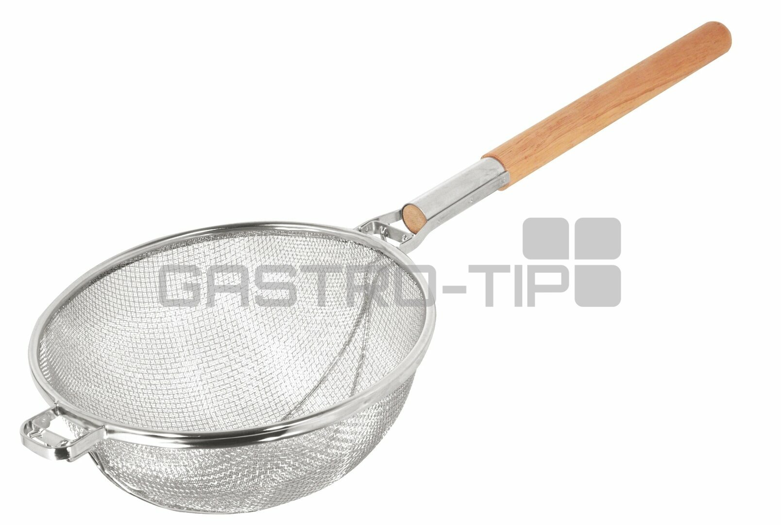 Profesionalní cedník s dvojitým nerezovým sítem (hrubé+jemné) úchytem a dřevěnou rukojetí pro snadnou manipulaci při práci.