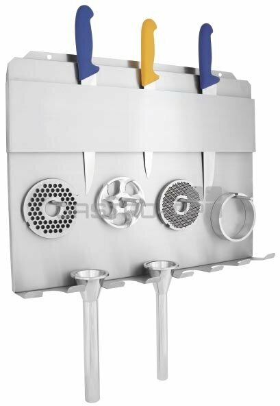 Nástěnný držák s lištou pro umístění nožů, 4 trny pro uložení řezného složení a 7 pozicemi pro narážecí trubice.