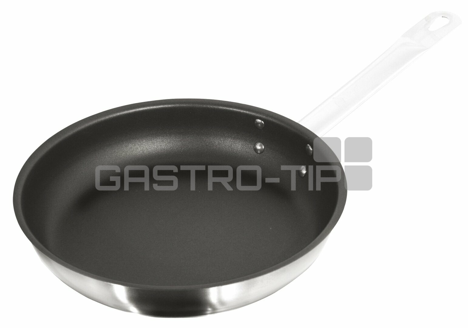 Pánev PADERNO z nerez oceli a teflonovou vrstvou má zesílené dno 7(8) mm pro lepší přenos tepla je vhodná pro všechny druhy sporáků (plynové, elektrické vč. sklokeramických a indukčních desek).