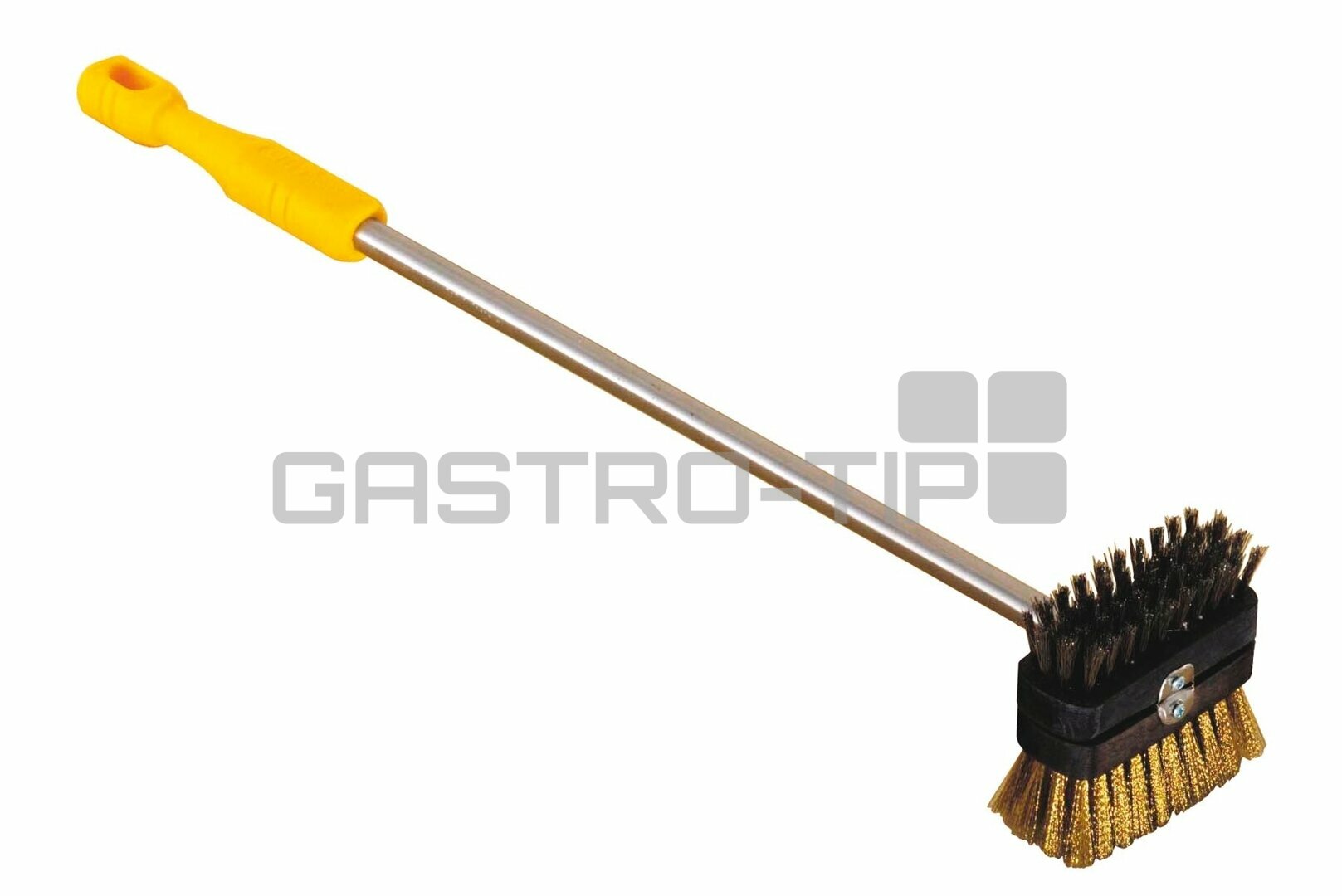 Kartáč na gril s oboustrannými vyměnitelnými štětinami je dlouhý 900 mm a má plastovou rukojeť.