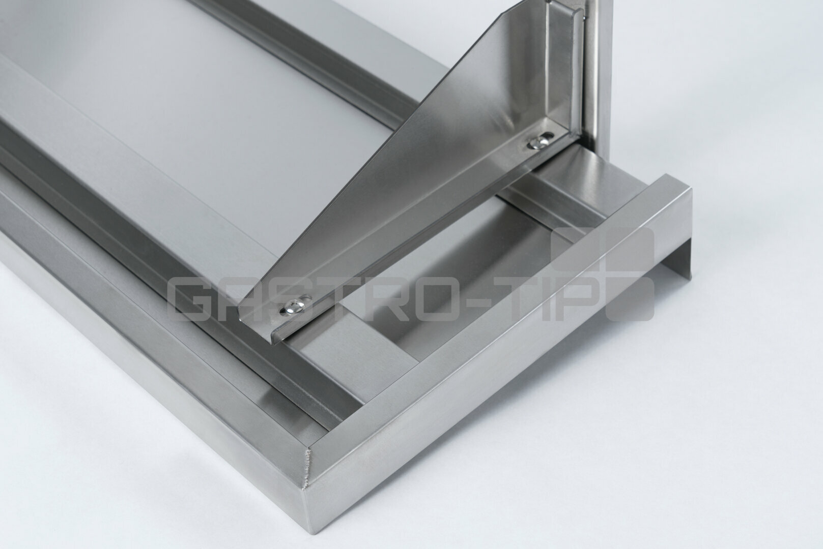 Nerezová konstrukce a police. Tloušťka police 4 cm (se zvýšeným zadním dílem 3 cm). Včetně vertikálních tyčí pro upevnění na stěnu - výška 35 cm. Police a upevňovací tyče mohou být stohovány a získat tak více úrovní.
