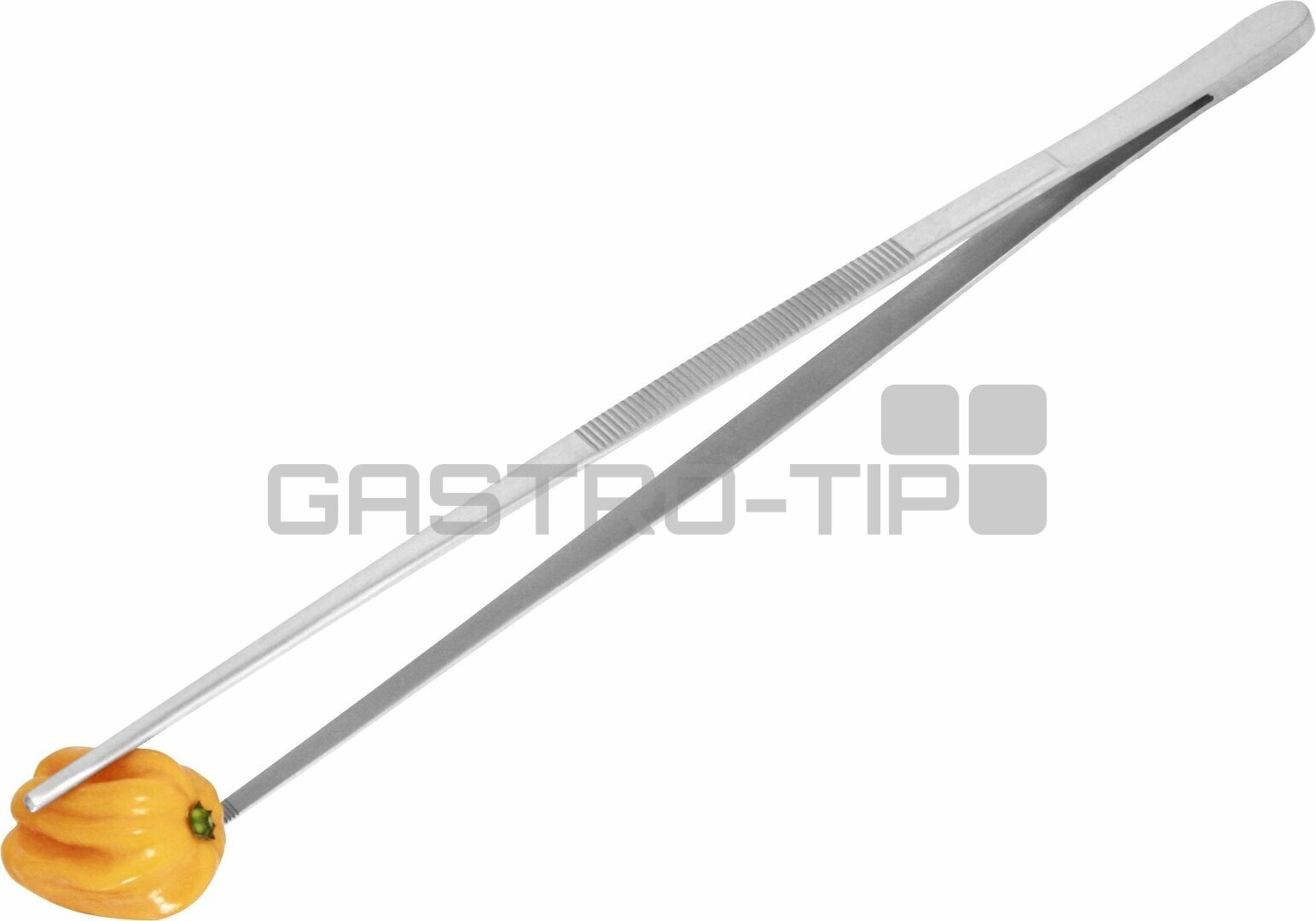 Nerezová pinzeta pro servírování, aranžování nebo např. otáčení grilovaných pokrmů na grilu nebo pánvi. Délka: 300 mm