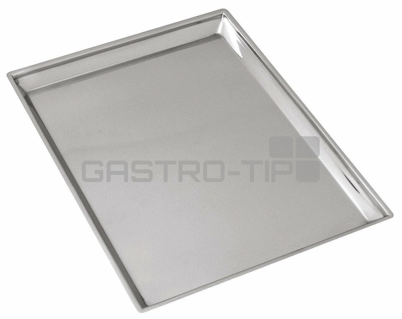 Lisovaný nerezový tác o síle materiálu 1 mm s ostrými rohy.