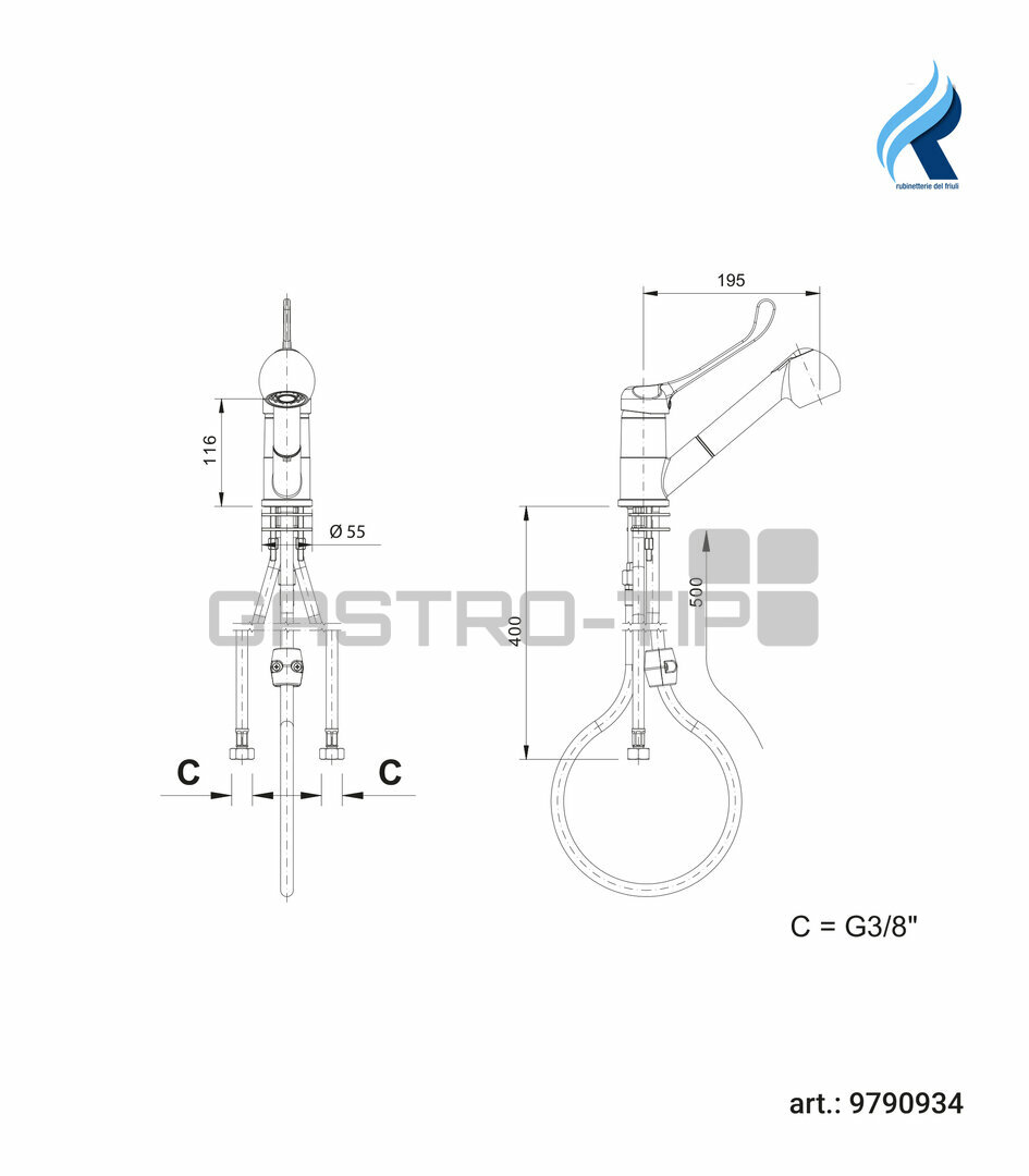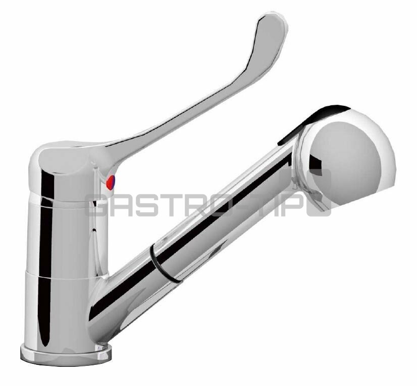 Model stolní, dlouhé hygienické pákové ovládání, výsuvná sprcha s tlakovou hadicí. Model je v robustním provedení, včetně přívodních hadic 3/8"(d=400 mm).