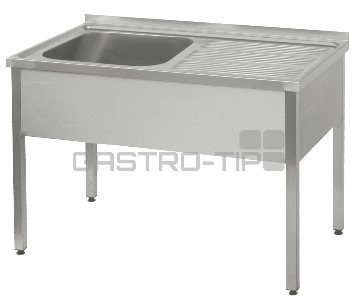 Celonerezové provedení s vevařenou lisovanou vanou a odkapovou plochou na levé straně, opláštěním čela, boků a zadním lemem vysokým 40 mm, tloušťka materiálu 1 mm. Stavitelné nohy. Základní provedení bez trnoží. Součástí dřezu není sifon.. Tuhá svařená konstrukce.