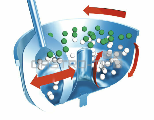 Patentovaný dvojitý pádlový systém pro lepší míchání a zkrácení doby míchání, zatímco jedno rameno vyzvedne směs ze dna na vrchol misky, druhé lopatkové rameno současně posune směs ke dnu. Tento dvojitý účinek výrazně zkracuje dobu míchání polovina. Otáčení mísy i ramene, dva 3-fázové motory samostatné pro mísu a hák.