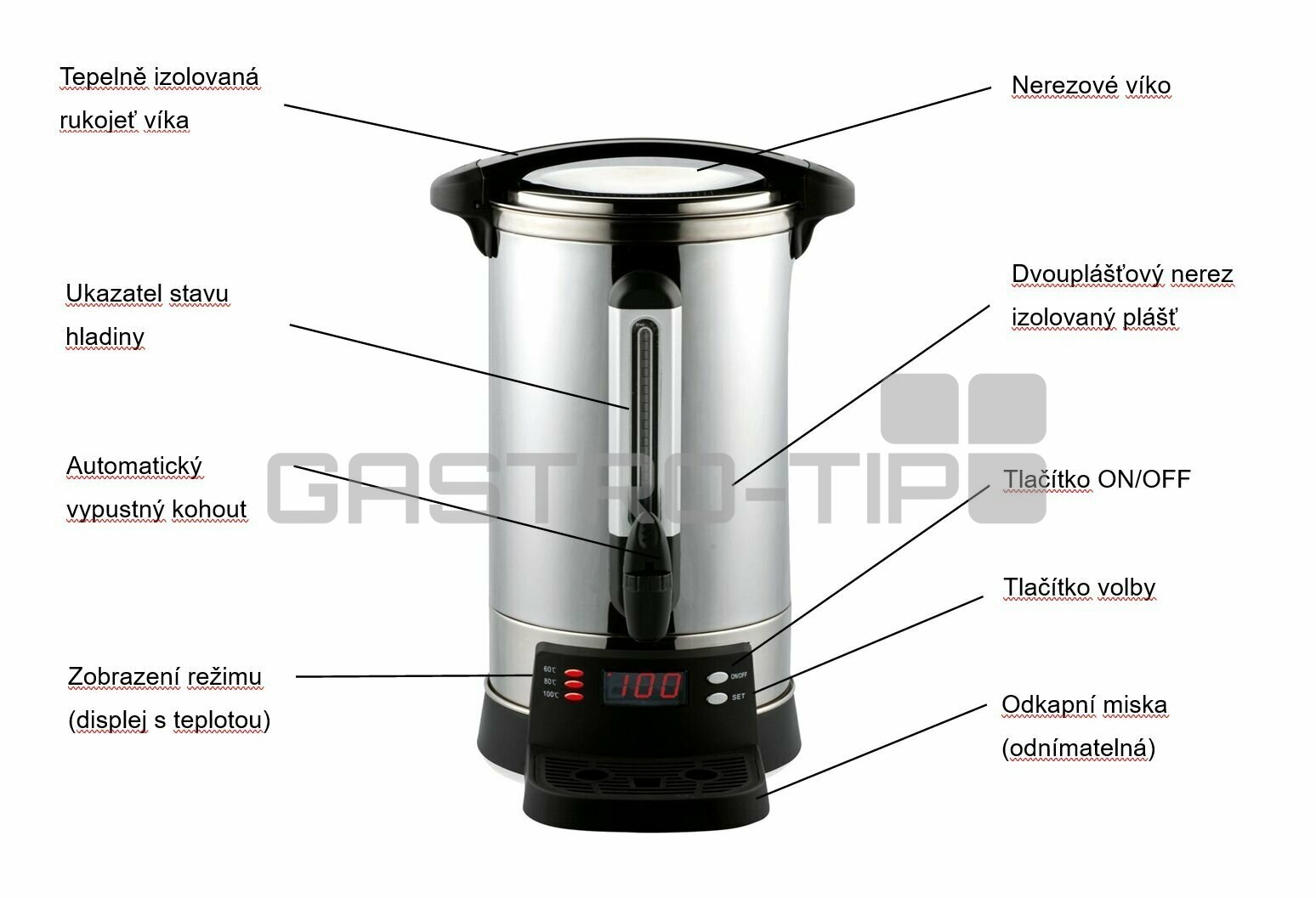 Automatické varné a udržovací termosy na přípravu a udržení horké vody a teplých nápojù. Luxusní celonerezové, dvouplášové, izolované provedení (minimální teplotní ztráty = ekonomický provoz). Automatický systém výroby horké vody, nebo udržení připravených nápojù na požadované teplotě. Výdej nápoje automatickým výpustným kohoutem a množství nápoje v termosu je přehledně indikováno na rysce hladinoměru. Snadné nastavení předvolené varné, udržovací, nebo výdejní teploty na digitálním ovladači (60 / 80 / 100°C), zobrazení aktuální teplotu vody a požadované předvolené teploty na podsvíceném displeji. Nerezové bezpečnostní víko s ergonomickým bezpečným plastovým madlem, odnímatelná odkapávací miska s vyjímatelným roštem pod výdejním kohoutkem.