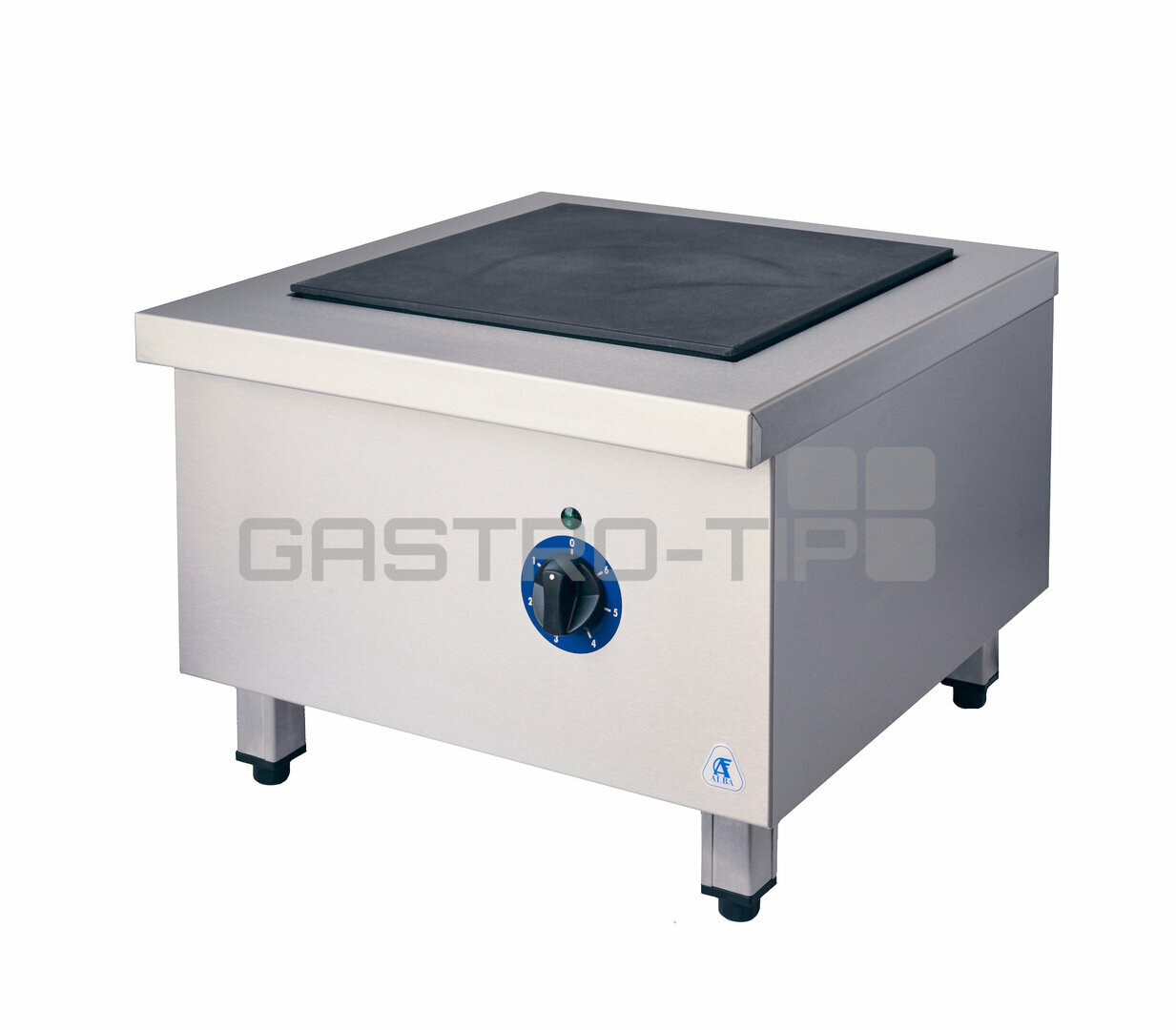 • Čtvercová elektrická plotna o rozměrech 400 x 400 mm, o 40 mm zvětšený průměr zvyšuje stabilitu varných nádob a zlepšuje přenos tepla