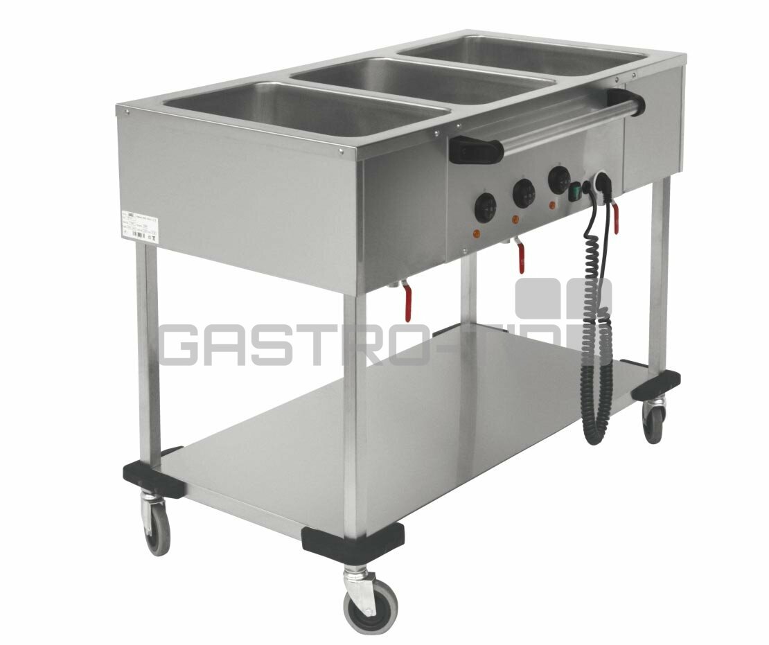 Celonerezový pojízdný výdejní stůl s vyhřívanou vodní lázní, v robustním provedení bez, nebo se spodní policí pevně spojenou s nohami, které jsou osazeny pojezdovými kolečky (2x brzděná). Vrchní deska s jednotlivými lisovaným vanami, každá samostatně regulována a vybavena výpustným ventilem.